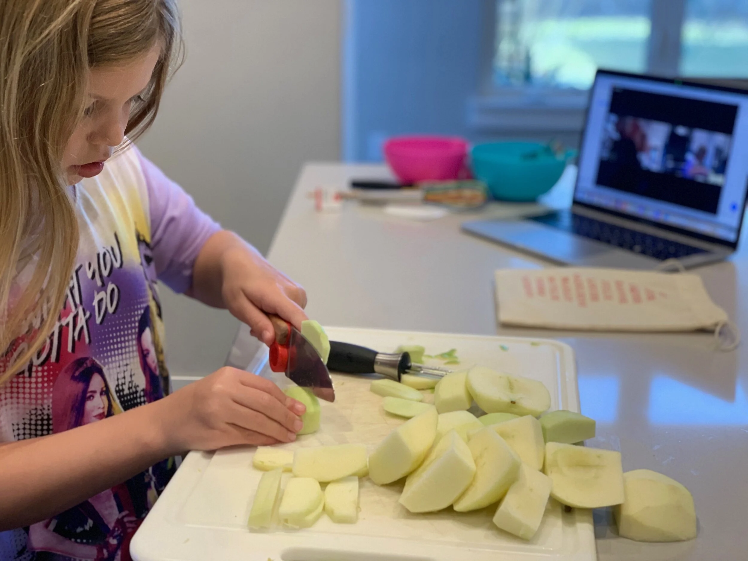 At eight-years-old, Piper could do every step of this recipe by herself. All she needed was someone to take the pan in-and-out of the oven. Plus, it doesn’t hurt to have a kitchen assistant/dad who can hurry along the apple slicing part. I could have used a helper myself, since slicing is not the height of baking excitement.