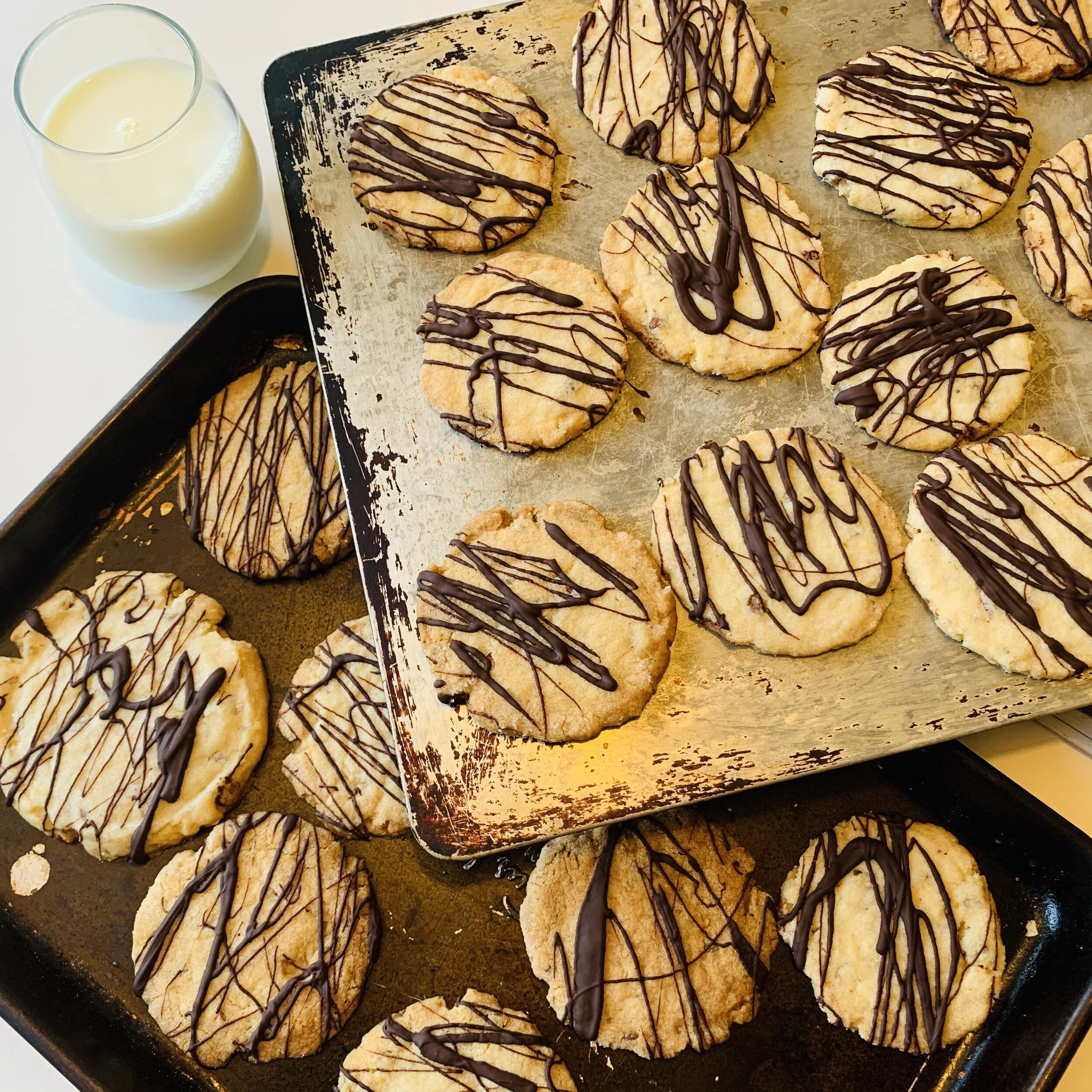 In the world of cookies, looks count. These buttery sugar cookies topped with a Jackson Pollock drizzle of chocolate are like the sparkly pixie dream girl of baked goods. Brought to a party, they dazzle.